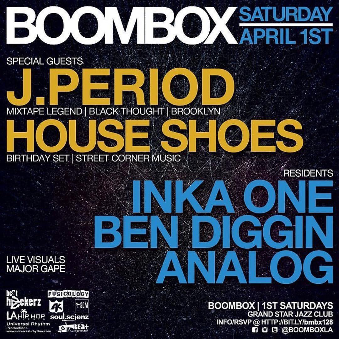 BOOMBOX returns [SAT.4/1] with a rare west coast appearance from NYC mixtape legend J.PERIOD + a birthday set from Street Corner Music boss HOUSE SHOES!! gonna be a fun one. RSVP here for discount entry before 11pm. let’s gooo!
