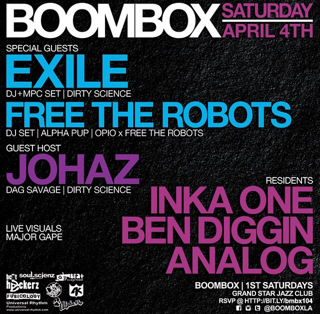 #LAHipHopEvents || SAT 4/4 @EXILERADIO @FREETHEROBOTS @DAGSAV @INKA_ONE @BEN_DIGGIN @DEEJAYANALOG! INFO/RSVP: http://t.co/rZD5Eb91NH