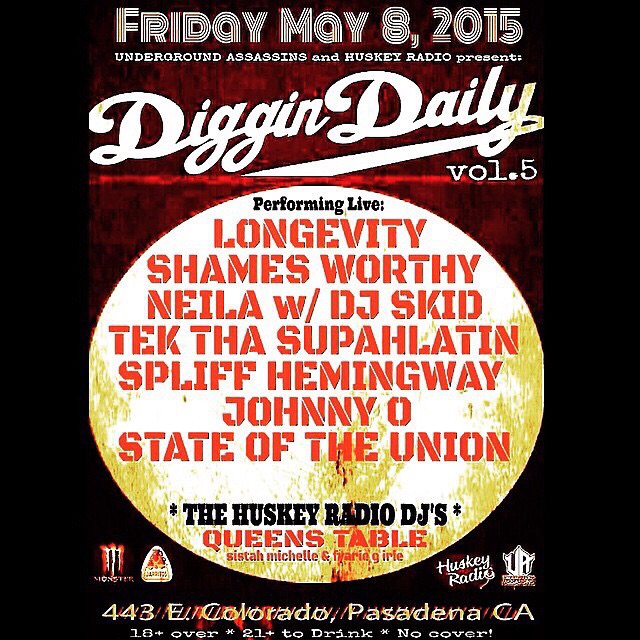 This Friday 5/8 at the Terrace in #Pasadena. FREE SHOW. 18 and over|21 and over to drink |Come out and party as DIGGIN DAILY provides you with another dope line up | #HuskeyRadio #UndergroundAssassins #diggindaily
