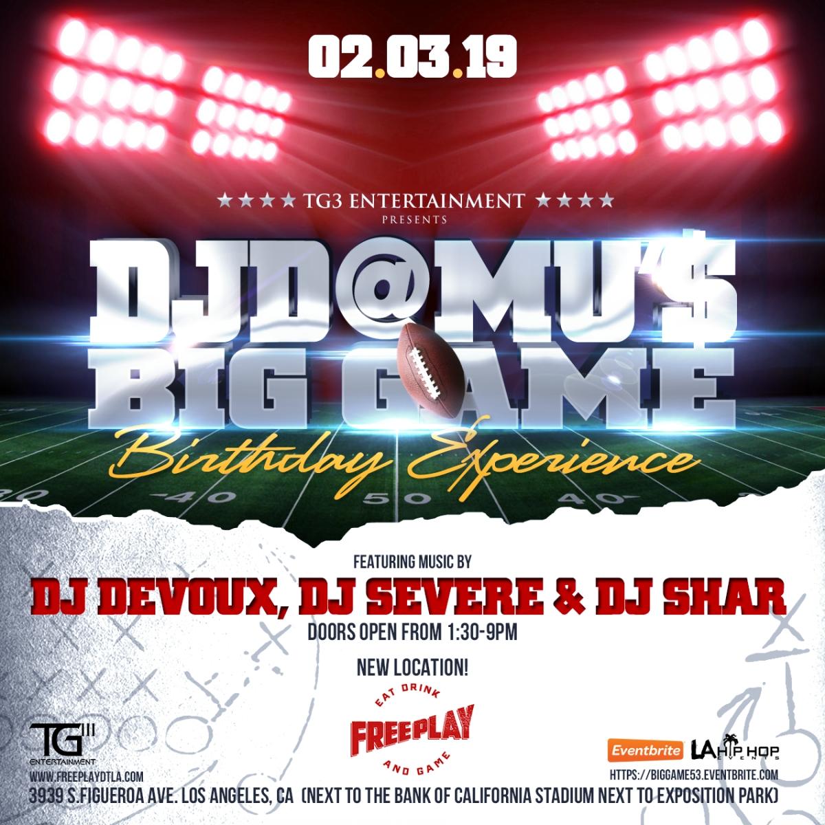 #TG3Entertainment brings you @dj_damu ‘s 2nd Annual Big Game Birthday Experience featuring Super Bowl 53 on all Tv’s and @djdevoux supplying the soundtrack at our #Brand NEW location FREE PLAY DTLA.