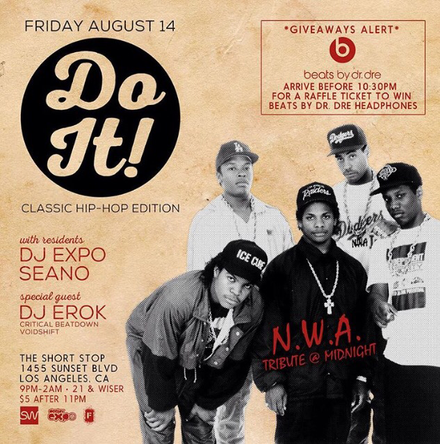 Friday Night [8/14] It’s a classic Hip-Hop Edition of #DoIt! The Shortstop Echo Park | Residents DJ Expo & DJ Seano + guest @therealdjerok, spinning everything 80s/90s Hip-Hop related, with a special NWA tribute at midnight to celebrate the release of #StraightOuttaCompton!