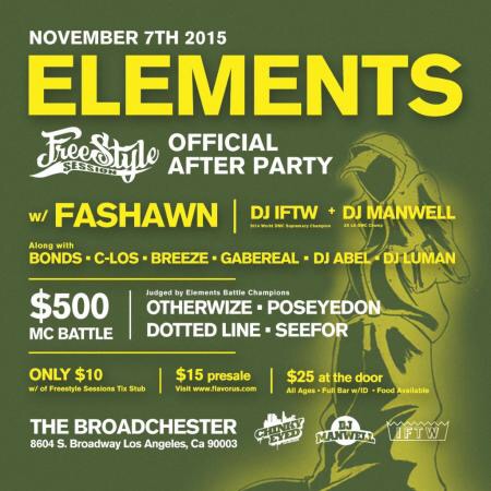 Elements returns for one night only as the official Freestyle Session after party. On the 1’s and 2’s will be D.j. Bonds Deejay Breeze Abel Sisneros Gabe Real Luis LuMan Robles Carlos C-Los Menendez. There will be an 8 man, $500 MC battle! A special set by 2014 World DMC Supremacy Champion DJ IFTW and 3 X LA DMC Champ DJ Manwell. Headlining the night will be Cali’s own Fashawn! ONLY $10 with proof of Freestyle Session Tix Stub. $15 PRESALE tix at www.flavorus.com. $25 at the door.