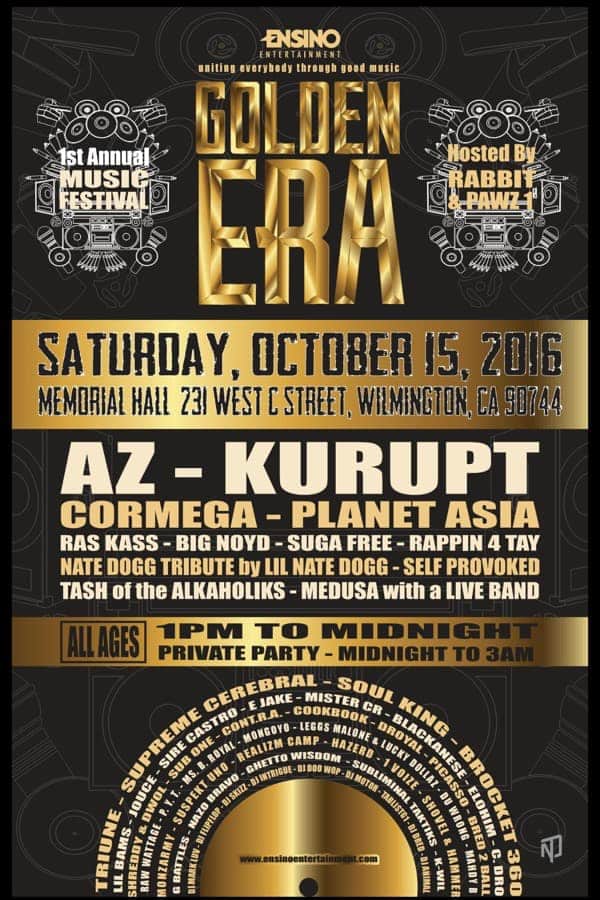 Located in the south bay of Los Angeles, Bringing you the best talent from the golden era of hip hop featuring Platinum selling artist AZ from New York performing classic hits like Sugarhill, The come up! Also Kurupt of the Dogg pound along with Underground superstars Cormega, Planet Asia, Raskass, Big Noyd of mobb deep and JUST ADDED!!!!! Sugafree, Medusa w/Live Band, Selfprovoked, Rappin4tay, Tash of tha liks, Nate Dogg Tribute from his Son Lil Nate, on two stages! with 20+ more artists and performers. come enjoy a Day of amazing music, authentic food, eclectic vendors and good vibes! All ages!