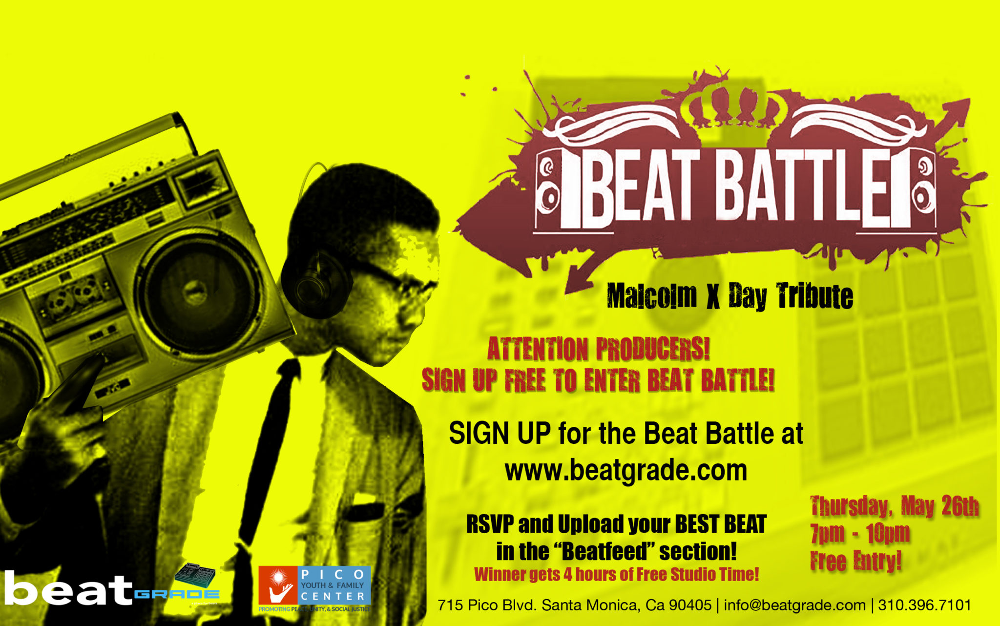 The long awaited Beat Battle is now here brought to you by beatGrade.com and The PYFC! We are hosting this event on Malcolm X Day, also during Hip Hop appreciation week. So this is a special time to honor iconic figures and their cultural contributions, and appreciate the elements and principals of Hip Hop culture.