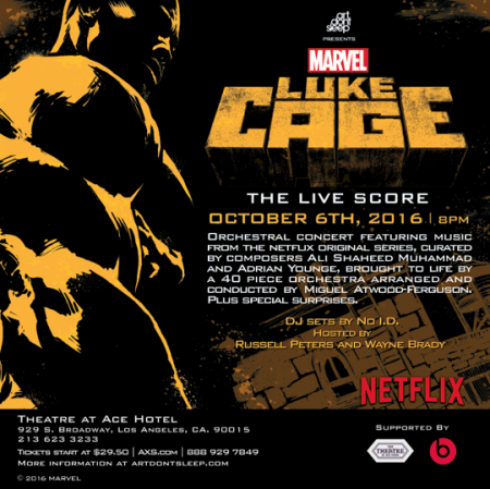 ArtDontSleep presents an unforgettable evening of music at The Theatre at Ace Hotel, curated by Ali Shaheed Muhammad and Adrian Younge, showing the diverse range of original score created for the Netflix original series, Marvel’s Luke Cage. Influences ranging from David Axelrod, Ennio Morricone, to A Tribe Called Quest and Wu Tang Clan will be brought to life by a 40-piece orchestra conducted and orchestrated by Miguel Atwood-Ferguson.