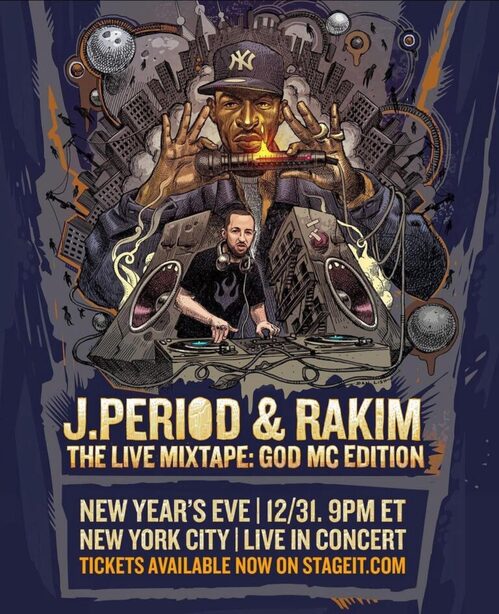 DJ/Producer J.PERIOD (The Roots, The Hamilton Mixtape) joins Hip-Hop Icon RAKIM for an epic New Year’s Eve performance of “The Live Mixtape: God MC Edition.” Streaming to you from NYC, the one-time-only event will feature an exclusive RAKIM performance of classics and deep cuts, never-before-heard freestyles, new J.PERIOD remixes and celebrity drop-ins plus a WORLD PREMIERE J.PERIOD X RAKIM video shot on the rooftops of Brooklyn. Ticket holders can also sign up for a VIP Meet and Greet, collect limited edition merchandise and bid on unique and personalized prize packages from Hip Hop’s most legendary lyricist and one of its most groundbreaking DJs.
