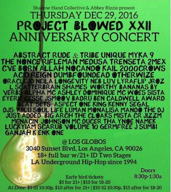 Then Later that week… Join us on Thur Dec 29 from 8:30p – 1:30a at Los Globos in Silverlake – Project Blowed XXII Anniversary Rap Concert – all crews reppin’