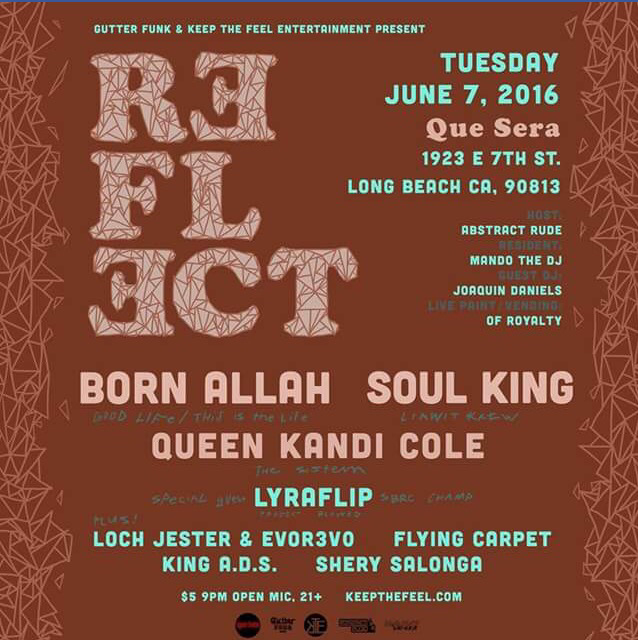 June 7th is Eection day and then Reflection night! Going harder than the primaries, not only is it the late great Purple One Prince’s birthday night, but #reflectlbc has a god, two kings, a queen and a Jester in the mix for good measure. Headlining is Born Allah alias Daddy Grace from the THIS IS THE LIFE movie, which is about the Los Angeles underground hip hop movement at The Good Life Cafe TM Health Food Centre Los Angeles. Also featuring Likwit Krew member Soul King, Queen Kandi Cole of The (SIS)TEM. SBRC 16 Bar Rap Champ Lyraflip, Loch Jester & EVOR3VO, Flying Carpet, King A.D.S., Shery Solnga. New Resident Mando the DJ. Guest selector Joaquin Daniels. All very talented performers baring their souls on this turnt Tuesday night. R3FL3CT with us!