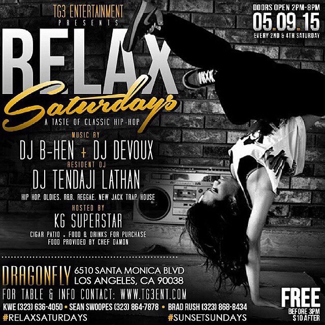 SAT 5/9 | #RelaxSaturdays | Free B4 3pm & $10 after | Relaxed Dress Code | Big Smoke Patio VALET (2 NEW PARKING LOTS) & Street Parking | Food & Drinks for Purchase. Music Provided By: DJ Devoux, Dj Bhen & Resident dj tendaji lathan | Hosted By the 1 and only kg superstar