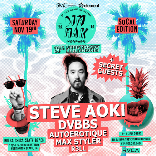 Orange County’s Bolsa Chica State Beach in Huntington Beach is a place to kick back and relax, but not anymore because Dim Mak announces a rowdy lineup for our 20th Anniversary SoCal show! Brace yourself for Steve Aoki and FRIENDS!!