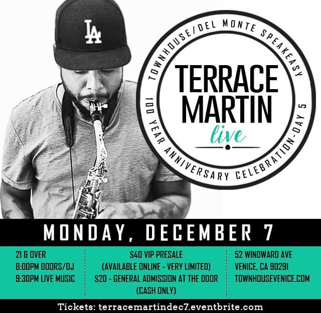Join Terrace Martin and friends for an all-star jam session to help commemorate the 100 year anniversary of the Del Monte Speakeasy, one of the oldest night time establishments in the Los Angeles area. Get your VIP tickets. Regular tickets will be sold at the door.