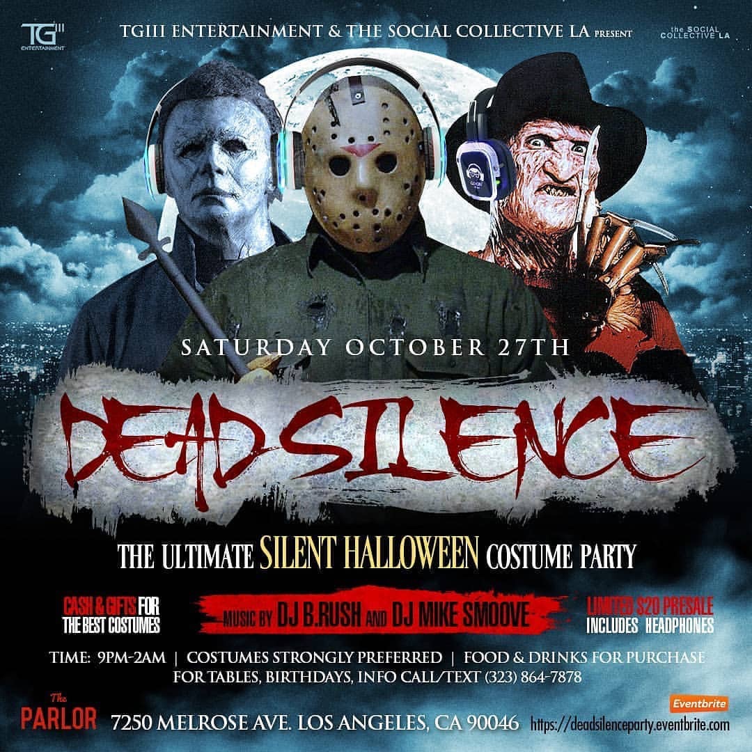 ? SAT, Oct27th ? Pre – #Halloween Weekend @TheParlorHW!! #TG3 & @thesocialcollectivela present #DeadSilence. The Sexiest, Scariest, & Funniest Costume & SILENT PARTY featuring @dj_b.rush @djmikesmoove & @thatsbroadway1