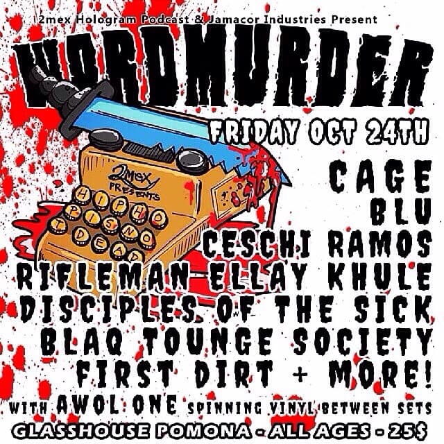 #LAHipHopEvents || FRI 10/24 | #2mex #WordMurder w/ #Cage #Blu #DisciplesOfTheSick #EllayKhule aka #Rifleman + more!! W/ #Awolone spinning vinyl between sets | All Ages | #Glasshouse #Pomona